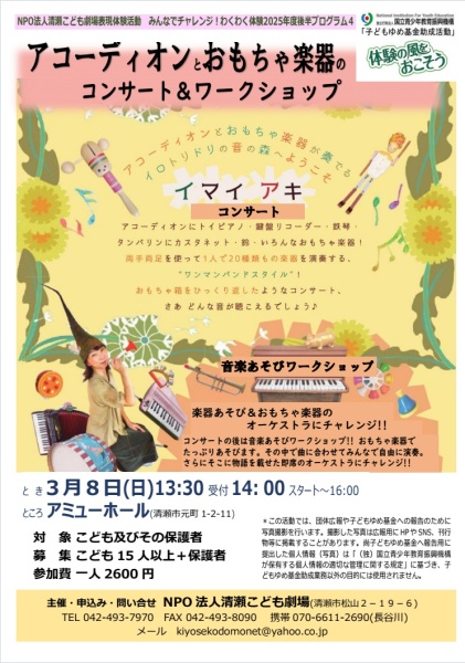 2026年3月8日(日)東京・清瀬こども劇場さんで「アコーディオンとおもちゃ楽器のコンサート&音楽あそびワークショップ」